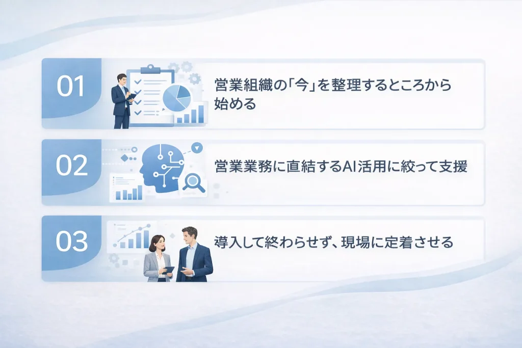 AI営業ラボでは、こうした失敗を避けるために、次の3点を大切にしています。